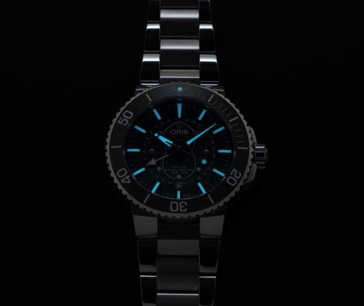プロダイバーのためにオリスが開発したポインタームーン機能は、月の周期と北半球の潮の満ち引きを表示し、中央の白いポインター針を29.5日の月の周期の中の正しい日に合わせる事により、文字盤上の白いアウトラインを介して対応する潮の満ち引きを読み取れます。