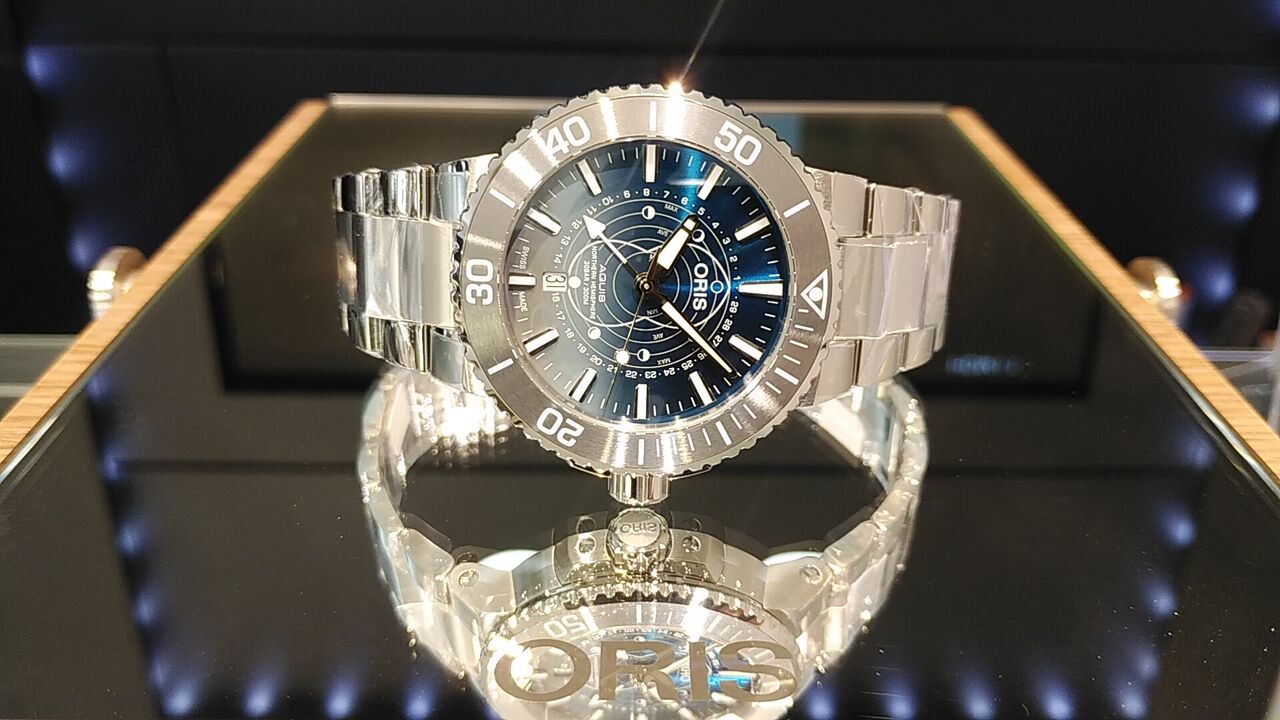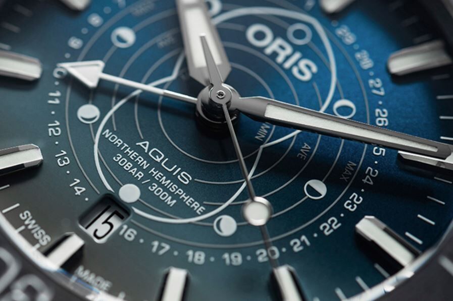 ワッデン海の干潟の情景をイメージしたブルーとグレーのグラデーションダイアルに月の満ち欠けと潮位を表示するオリス独自開発のポインタームーン機能が備わります