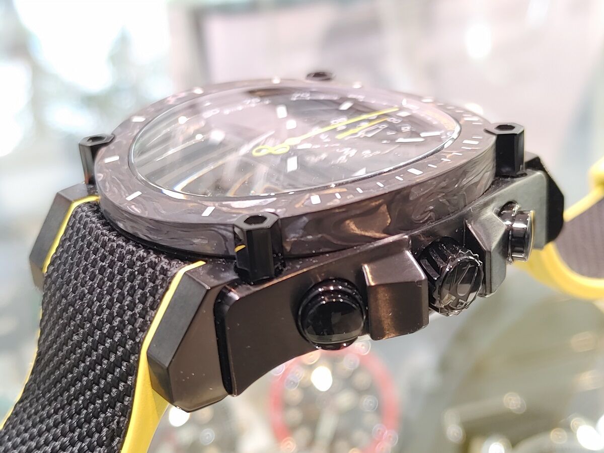文字盤とベゼルにはカーボンが使用されていて堅牢性と高級感も併せ持ち、極厚なカーボンベゼルが他に類を見ない存在感を放っています