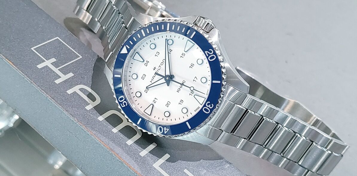 先日のブログでお伝えさせていただいた、爽やかなハミルトンの夏の新作「カーキネイビースキューバ」の小振りなボーイズサイズが入荷しております。