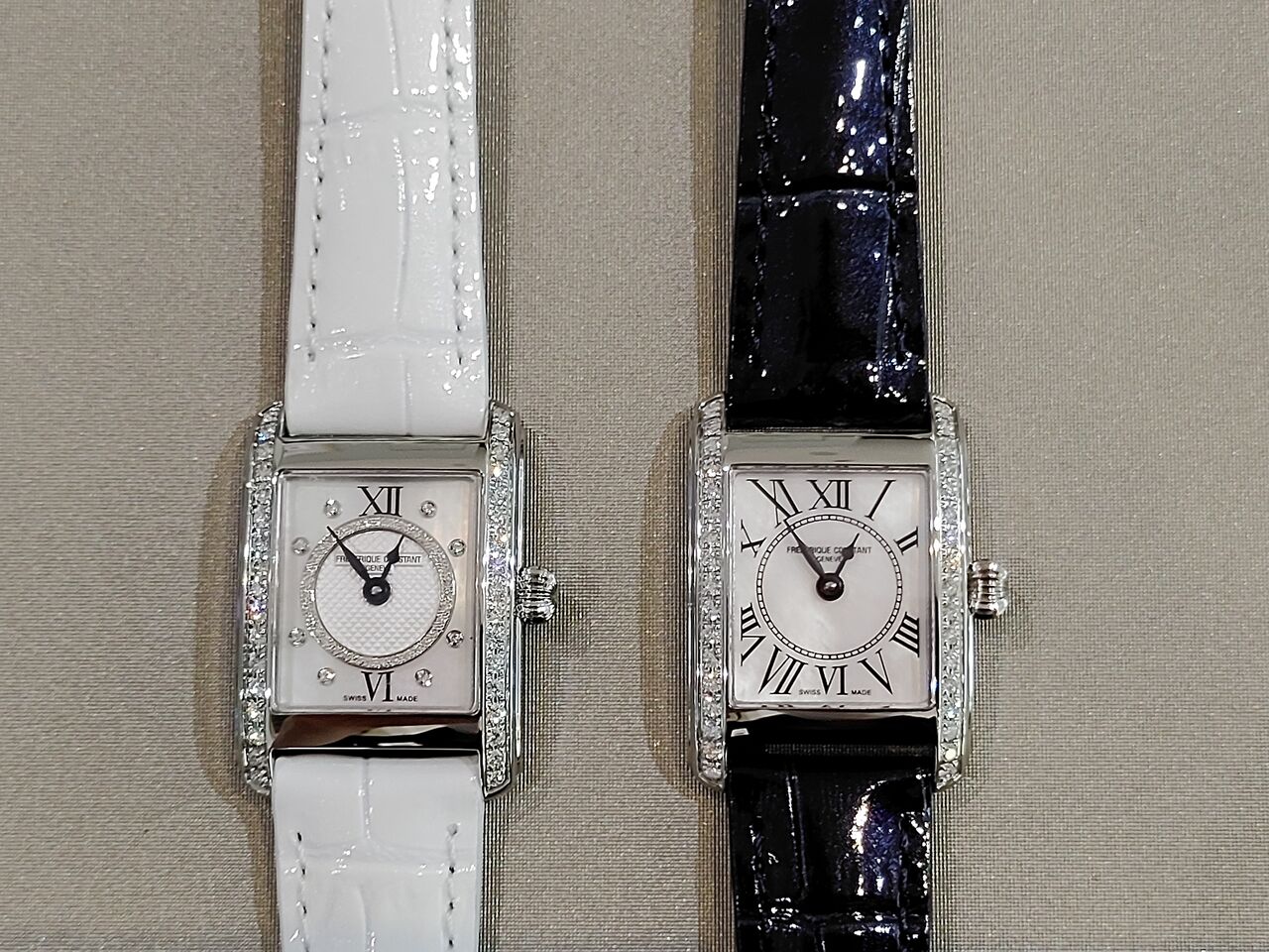 両方とも左が文字盤にもダイヤモンドを配置し、マザーオブパール文字盤です。