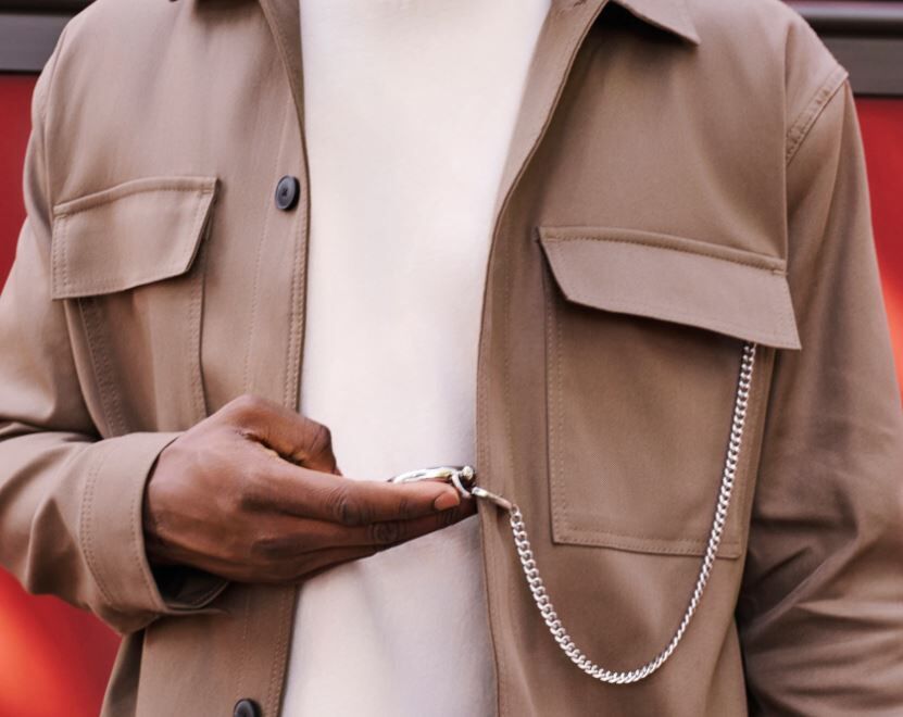 取り外し可能なチェーンとレザー製のトラベルポーチは付属しております。