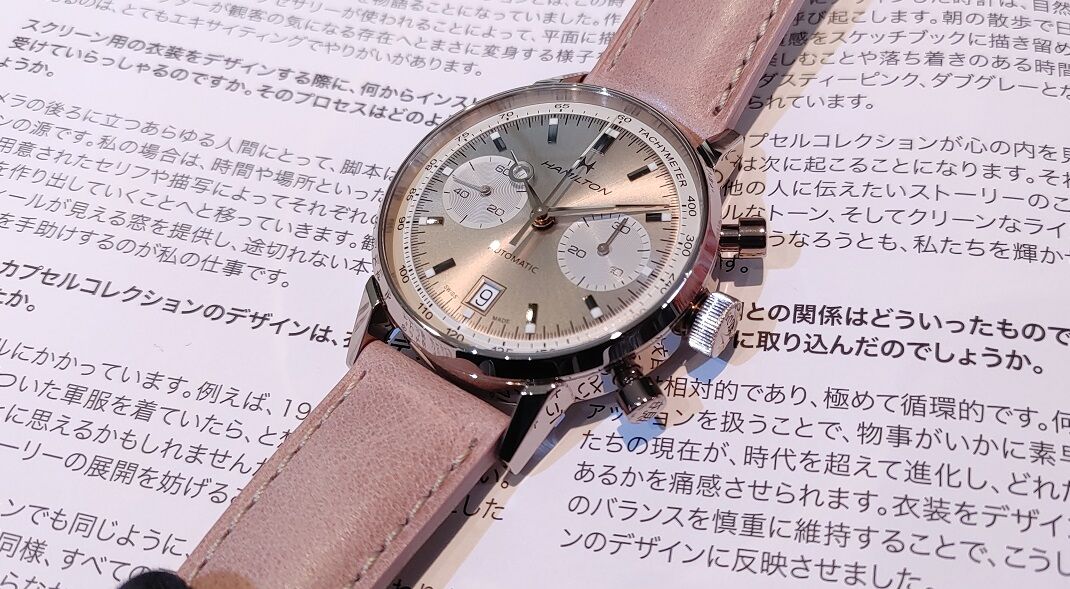 本日ご紹介するのは、エミー賞を受賞した実績もあるコスチュームデザイナー「ジャニー・ブライアント」とハミルトンとのコラボシリーズ「カプセルコレクション」より、男性にもおすすめ出来るこちらのモデルです。
