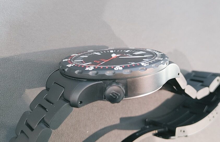 ケース径44mm、厚み13.3mmと決して小振りではございませんが、5,000m防水という事を考えると、驚くべきサイズに収まっています。