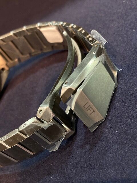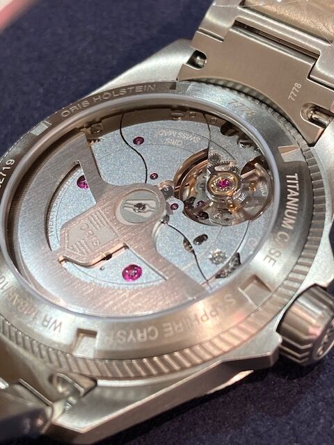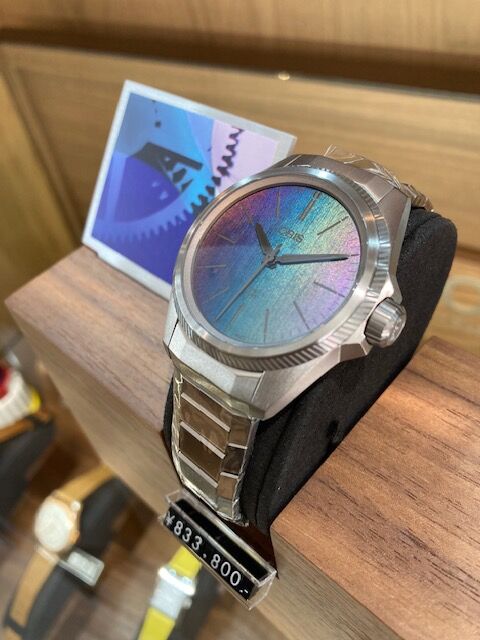 チタンケース&チタンブレスレットにダイヤルまでチタンを使用し、チタン製ダイヤルに最新のレーザー技術を駆使、ブルー、グリーン、バイオレットの色彩は、全て光の反射によるもので色素は一切使ってないとの事、いわゆる技術の美ですね。
