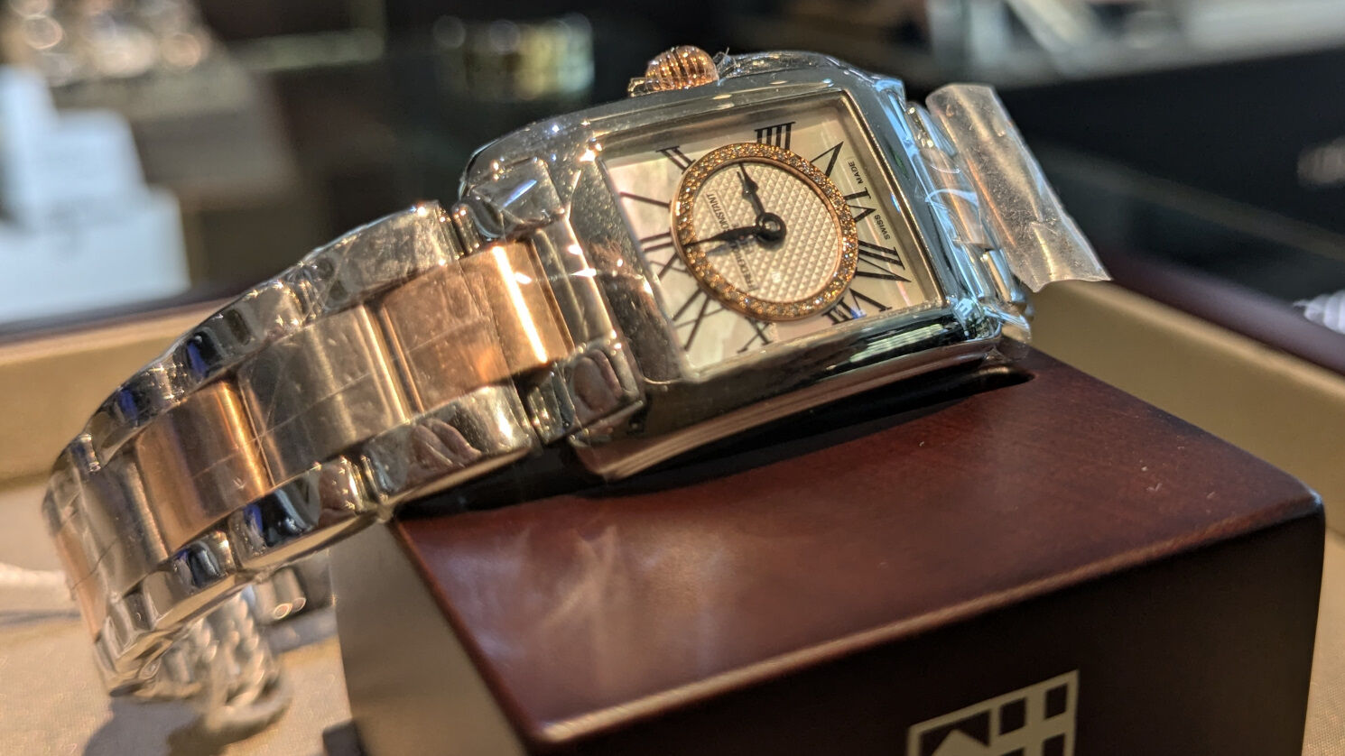 FC-200MC12Bは文字盤に石は一切ありませんが、ギョーシェ彫りがあしらわれ、