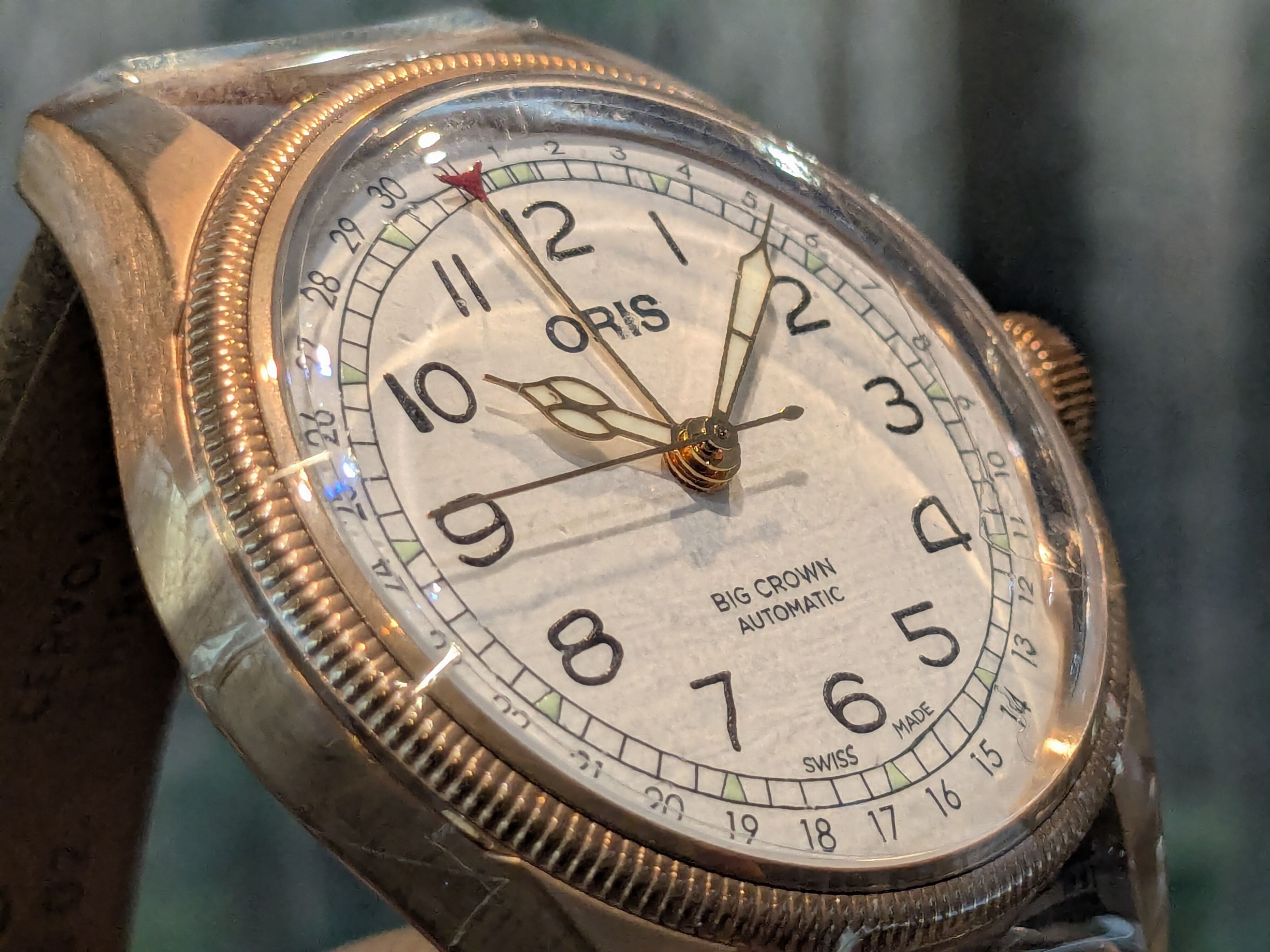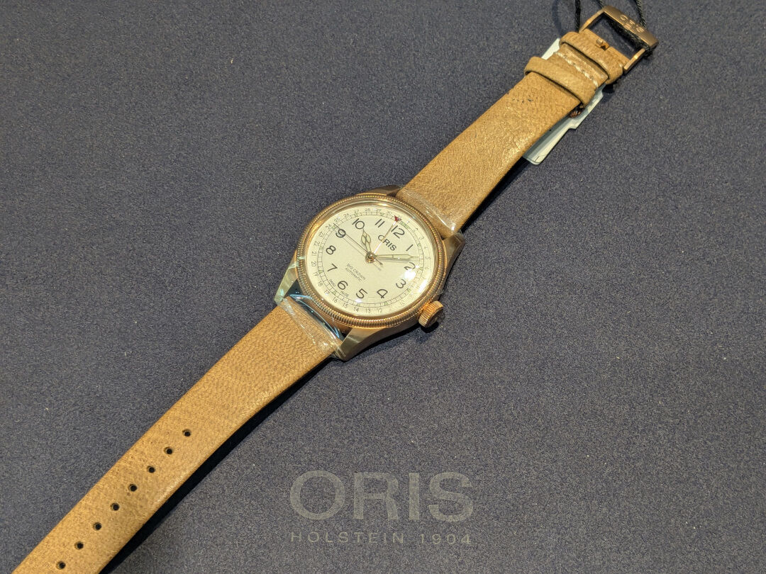 ブロンズ製のケースに綺麗に映えるホワイト色のダイアル。